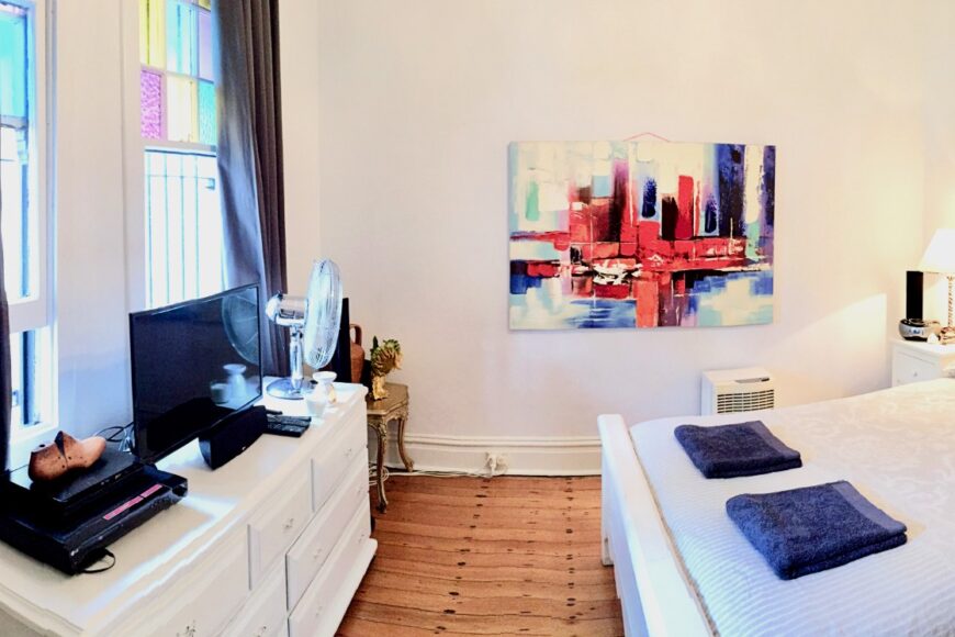 This gorgeous room is at the front of the house, downstairs. It is oversized and beautifully furnished. The room has an additional trundle bed stored under the main bed and can be set up very easily. The trundle bed has a very high quality single mattress. The bedroom has a great TV with google chrome, allowing full streaming services and to all our free streaming stations, that includes (amongst many others), Disney +, Netflix, Stan, Paramount + and iView.