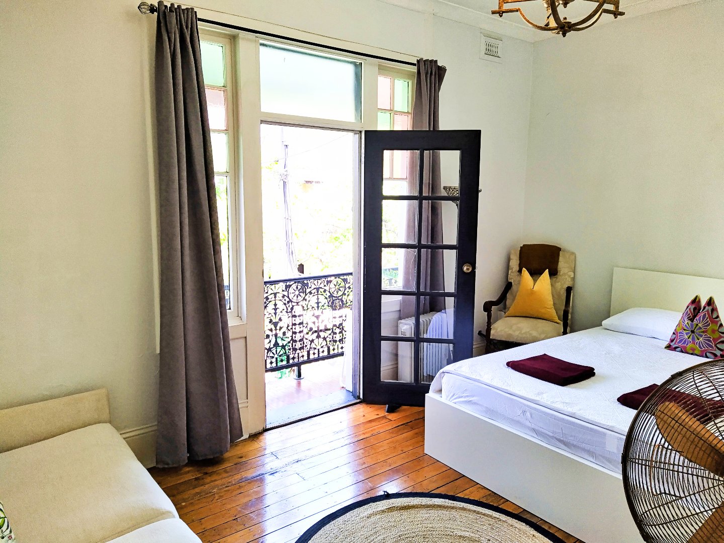 The room has a large Smart Tv, with full streaming services and free access to Netflix, Disney +, Stan, iView and Paramount + to name a few streaming services. The room flows out to a large balcony with an outdoor setting and gorgeous plants. A perfect place for a coffee or an evening drink before dinner.